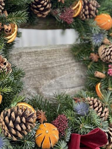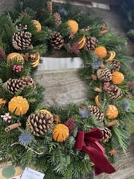 The wreaths contain foliage from the Eden valley, Eucalyptus from Irish Green Guys mixed in with a range of imported greens (including Norwegian spruce) to achieve that luxurious elegant finish you expect from The Flower Studio. (as shown is close up photo.)